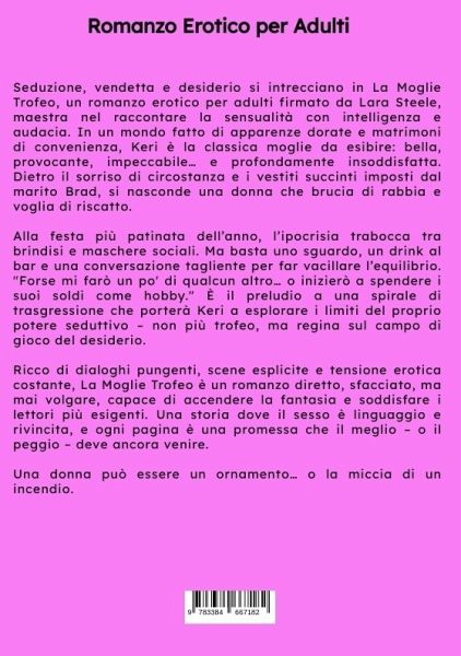 Provocante, audace e senza freni, Doppia Scopata è un romanzo erotico pensato per un pubblico adulto che ama esplorare i confini del desiderio con eleganza narrativa e carica sensuale. In un intreccio di fantasie condivise, segreti taciuti e tensioni sessuali palpabili, Lara Steele ci conduce in una storia in cui due donne, Vivian e Penny, decidono di sorprendere i loro mariti... ma a essere sorpresi, forse, saranno proprio loro.Tra lingerie provocante, sguardi troppo lunghi e conversazioni che flirtano pericolosamente con la tentazione, la storia si apre con una premessa semplice ma esplosiva: "Ci stava fissando entrambe, pulcino... Forse ha bisogno di scopare, ma d'altra parte, può apprezzare voi belle signore anche se siamo entrambe sposate." Il gioco è cominciato, e con esso si apre un mondo in cui la fedeltà vacilla sotto il peso del piacere e la complicità femminile si tinge di provocazione e sfida.Vivace nei dialoghi, spudorato nel ritmo e intensamente erotico, questo romanzo offre scene di sesso esplicito raccontate con franchezza, ironia e un tocco di malizia irresistibile. Doppia Scopata è un invito a lasciarsi andare, a esplorare fantasie che vivono sotto la superficie della quotidianità e a godere, senza censure, del piacere condiviso.Un romanzo che non si limita a raccontare, ma che accende i sensi e invita a desiderare... ancora.