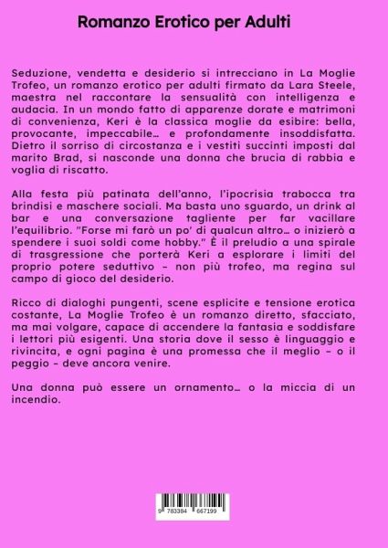Provocante, audace e senza freni, Doppia Scopata è un romanzo erotico pensato per un pubblico adulto che ama esplorare i confini del desiderio con eleganza narrativa e carica sensuale. In un intreccio di fantasie condivise, segreti taciuti e tensioni sessuali palpabili, Lara Steele ci conduce in una storia in cui due donne, Vivian e Penny, decidono di sorprendere i loro mariti... ma a essere sorpresi, forse, saranno proprio loro.Tra lingerie provocante, sguardi troppo lunghi e conversazioni che flirtano pericolosamente con la tentazione, la storia si apre con una premessa semplice ma esplosiva: "Ci stava fissando entrambe, pulcino... Forse ha bisogno di scopare, ma d'altra parte, può apprezzare voi belle signore anche se siamo entrambe sposate." Il gioco è cominciato, e con esso si apre un mondo in cui la fedeltà vacilla sotto il peso del piacere e la complicità femminile si tinge di provocazione e sfida.Vivace nei dialoghi, spudorato nel ritmo e intensamente erotico, questo romanzo offre scene di sesso esplicito raccontate con franchezza, ironia e un tocco di malizia irresistibile. Doppia Scopata è un invito a lasciarsi andare, a esplorare fantasie che vivono sotto la superficie della quotidianità e a godere, senza censure, del piacere condiviso.Un romanzo che non si limita a raccontare, ma che accende i sensi e invita a desiderare... ancora.