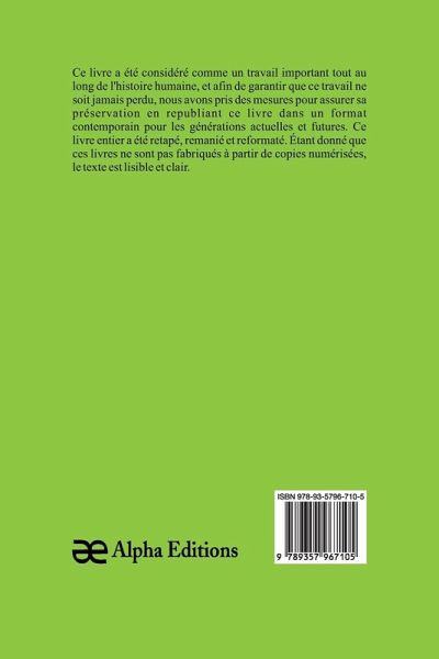 La monadologie (1909); avec étude et notes de Clodius Piat, un livre classique, a été considéré comme important tout au long de l'histoire de l'humanité, et pour que cet ouvrage ne soit jamais oublié, chez Alpha Editions, nous avons fait des efforts pour sa préservation en rééditant ce livre dans un format moderne pour les générations présentes et futures. Tout ce livre a été reformaté, retapé et conçu. Ces livres ne sont pas constitués de copies numérisées de leur ¿uvre originale et le texte est donc clair et lisible.