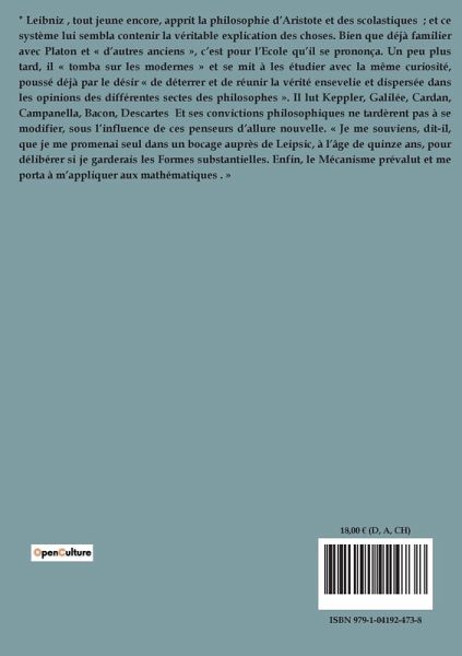 " Leibniz , tout jeune encore, apprit la philosophie d¿Aristote et des scolastiques ; et ce système lui sembla contenir la véritable explication des choses. Bien que déjà familier avec Platon et « d¿autres anciens », c¿est pour l¿Ecole qüil se prononça. Un peu plus tard, il « tomba sur les modernes » et se mit à les étudier avec la même curiosité, poussé déjà par le désir « de déterrer et de réunir la vérité ensevelie et dispersée dans les opinions des différentes sectes des philosophes ». Il lut Keppler, Galilée, Cardan, Campanella, Bacon, Descartes Et ses convictions philosophiques ne tardèrent pas à se modifier, sous l¿influence de ces penseurs d¿allure nouvelle. « Je me souviens, dit-il, que je me promenai seul dans un bocage auprès de Leipsic, à l¿âge de quinze ans, pour délibérer si je garderais les Formes substantielles. Enfin, le Mécanisme prévalut et me porta à m¿appliquer aux mathématiques . »