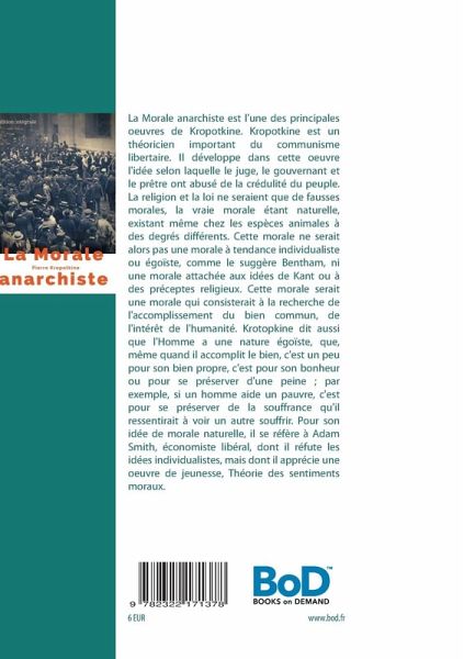 La Morale anarchiste est l'une des principales oeuvres de Kropotkine. Kropotkine est un théoricien important du communisme libertaire. Il développe dans cette oeuvre l'idée selon laquelle le juge, le gouvernant et le prêtre ont abusé de la crédulité du peuple. La religion et la loi ne seraient que de fausses morales, la vraie morale étant naturelle, existant même chez les espèces animales à des degrés différents. Cette morale ne serait alors pas une morale à tendance individualiste ou égoïste, comme le suggère Bentham, ni une morale attachée aux idées de Kant ou à des préceptes religieux. Cette morale serait une morale qui consisterait à la recherche de l'accomplissement du bien commun, de l'intérêt de l'humanité. Krotopkine dit aussi que l'Homme a une nature égoïste, que, même quand il accomplit le bien, c'est un peu pour son bien propre, c'est pour son bonheur ou pour se préserver d'une peine ; par exemple, si un homme aide un pauvre, c'est pour se préserver de la souffrance qu'il ressentirait à voir un autre souffrir. Pour son idée de morale naturelle, il se réfère à Adam Smith, économiste libéral, dont il réfute les idées individualistes, mais dont il apprécie une oeuvre de jeunesse, Théorie des sentiments moraux.