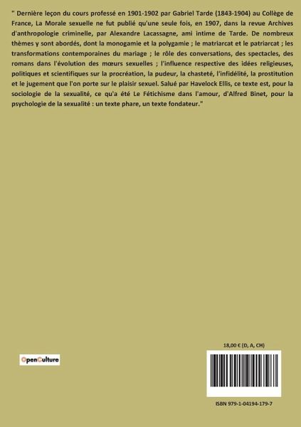 L'uvre de Gabriel Tarde, ' La morale sexuelle ', s'ouvre sur une exploration audacieuse des comportements humains à travers le prisme de la sexualité. Dans un monde en pleine transformation sociale et culturelle, Tarde s'interroge sur les normes et les valeurs qui régissent les relations entre les sexes. Ce texte, ancré dans la fin du XIXe siècle, reflète les préoccupations d'une époque marquée par des débats intenses sur la moralité et la liberté individuelle. L'auteur, sociologue et criminologue de renom, utilise son expertise pour analyser les changements sociaux et psychologiques qui influencent les comportements sexuels. Il aborde des thèmes tels que le désir, la répression et la transgression, tout en questionnant les structures sociales qui encadrent ces comportements. À travers un passage méthodique, Tarde examine les interactions entre l'individu et la société, offrant ainsi une réflexion sur la manière dont les normes sexuelles sont construites et maintenues. Ce texte se distingue par sa capacité à mettre en lumière les tensions entre tradition et modernité, entre conformisme et émancipation. En explorant les implications sociales de la morale sexuelle, Tarde invite le lecteur à réfléchir sur les enjeux de la liberté personnelle et de la responsabilité collective. Son analyse, bien que contextualisée dans son temps, résonne encore aujourd'hui, offrant des perspectives sur les débats contemporains autour de la sexualité et de l'éthique. En développant une compréhension des mécanismes sociaux qui sous-tendent la morale sexuelle, ce livre nous apprend à mieux appréhender les complexités des relations humaines. Par sa démarche analytique, nous percevons désormais mieux les influences culturelles et historiques qui façonnent nos perceptions de la sexualité.