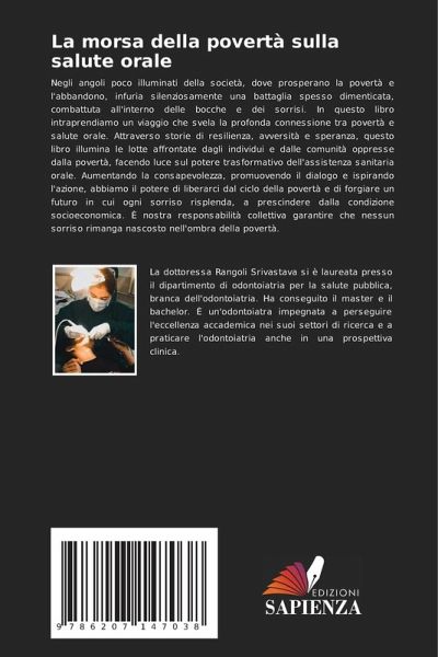 Negli angoli poco illuminati della società, dove prosperano la povertà e l'abbandono, infuria silenziosamente una battaglia spesso dimenticata, combattuta all'interno delle bocche e dei sorrisi. In questo libro intraprendiamo un viaggio che svela la profonda connessione tra povertà e salute orale. Attraverso storie di resilienza, avversità e speranza, questo libro illumina le lotte affrontate dagli individui e dalle comunità oppresse dalla povertà, facendo luce sul potere trasformativo dell'assistenza sanitaria orale. Aumentando la consapevolezza, promuovendo il dialogo e ispirando l'azione, abbiamo il potere di liberarci dal ciclo della povertà e di forgiare un futuro in cui ogni sorriso risplenda, a prescindere dalla condizione socioeconomica. È nostra responsabilità collettiva garantire che nessun sorriso rimanga nascosto nell'ombra della povertà.