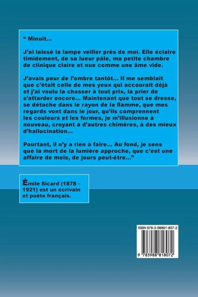 " Minuit... J'ai laissé la lampe veiller près de moi. Elle éclaire timidement, de sa lueur pâle, ma petite chambre de clinique claire et nue comme une âme vide. J'avais peur de l'ombre tantôt... Il me semblait que c'était celle de mes yeux qui accourait déjà et j'ai voulu la chasser à tout prix, la prier de s'attarder encore... Maintenant que tout se dresse, se détache dans le rayon de la flamme, que mes regards vont dans le jour, qu'ils comprennent les couleurs et les formes, je m'illusionne à nouveau, croyant à d'autres chimères, à des mieux d'hallucination... Pourtant, il n'y a rien à faire... Au fond, je sens que la mort de la lumière approche, que c'est une affaire de mois, de jours peut-être..."