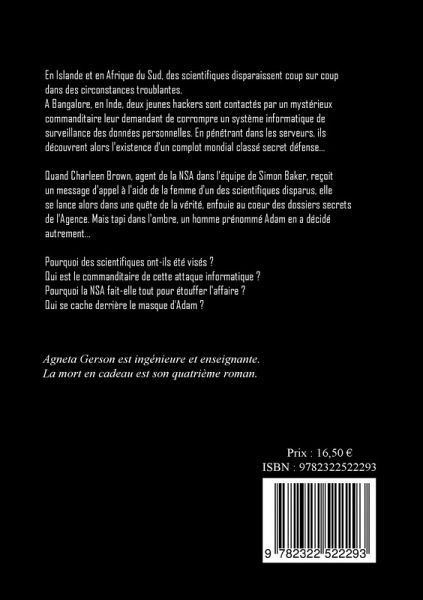 En Islande et en Afrique du Sud, des scientifiques disparaissent coup sur coup dans des circonstances troublantes.A Bangalore, en Inde, deux jeunes hackers sont contactés par un mystérieux commanditaire leur demandant de corrompre un système informatique de surveillance des données personnelles. En pénétrant dans les serveurs, ils découvrent alors l'existence d'un complot mondial classé secret défense...Quand Charleen Brown, agent de la NSA dans l'équipe de Simon Baker, reçoit un message d'appel à l'aide de la femme d'un des scientifiques disparus, elle se lance alors dans une quête de la vérité, enfouie au coeur des dossiers secrets de l'Agence. Mais tapi dans l'ombre, un homme prénommé Adam en a décidé autrement...Pourquoi des scientifiques ont-ils été visés ? Qui est le commanditaire de cette attaque informatique ? Pourquoi la NSA fait-elle tout pour étouffer l'affaire ? Qui se cache derrière le masque d'Adam ?