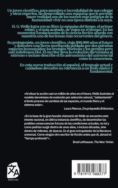 Un joven científico, para asombro e incredulidad de sus colegas y otros expertos, ha desarrollado una máquina que le permite hacer realidad uno de los sueños más antiguos de la humanidad: vivir en una época distinta a la suya. H. G. Wells logra con su libro La máquina del tiempo, el primer relato, y el más acabado, de viajes en el tiempo. En los momentos fundacionales de la ciencia ficción aborda con maestría uno de los temas más recurrentes del género. Su protagonista, un joven científico, viaja 800.000 años al futuro y descubre una tierra moribunda poblada por dos extrañas especies humanoides: los brutales Morlocks y los gentiles pero casi indefensos Eloi. El escritor lleva la evolución darwiniana al extremo e incluso describe el fin astronómico del universo tal como lo conocemos. En esta nueva traducción al español, el lenguaje actual y cuidadoso devuelve su relevancia a un texto clásico y fundamental.