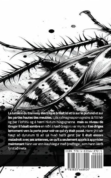 La lumière du tramway électrique brillait ici et là sur le plafond et sur les parties hautes des meubles. Ljós rafmagnssporvagnsins lá föl hér og Þar í loftinu og á hærri hlutum húsgagnanna mais au niveau de Gregor il faisait sombre en niðri á hæð Gregors var myrkur Il se dirigea lentement vers la porte pour voir ce qui s'y était passé. Hann ýtti sér hægt að dyrunum til að sjá hvað hafði gerst Þar il était encore maladroit avec ses antennes, ce qu'il a seulement appris à apprécier maintenant hann var enn klaufalegur með Þreifingar, sem hann lærði fyrst að meta Son côté gauche semblait avoir une longue cicatrice désagréablement serrée. Vinstri hlið hans virtist vera með eitt langt, óÞægilega Þröngt ör et il a dû littéralement boiter sur ses deux rangées de jambes og hann varð bókstaflega að haltra á tveimur fótaröðunum sínum Par ailleurs, une des jambes avait été sérieusement blessée lors des incidents du matin. Tilviljun hafði annar fóturinn slasast alvarlega í atvikum morgunsins c'était presque un miracle qu'une seule de ses jambes ait été blessée Það var nánast kraftaverk að aðeins annar fótur hans slasaðist et il traîna sa jambe sans vie og hann dró fótinn líflausan Ce n'est qu'une fois arrivé à la porte qu'il réalisa ce qui l'avait réellement attiré là. Fyrst Þegar hann kom að dyrunum áttaði hann sig á Því hvað hafði raunverulega tælt hann Þangað c'était l'odeur de quelque chose de comestible qui l'avait attiré là Það var lyktin af einhverju ætilegu sem hafði tælt hann Þangað