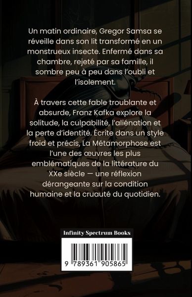 Un matin ordinaire, Gregor Samsa se réveille dans son lit transformé en un monstrueux insecte. Enfermé dans sa chambre, rejeté par sa famille, il sombre peu à peu dans l'oubli et l'isolement. À travers cette fable troublante et absurde, Franz Kafka explore la solitude, la culpabilité, l'aliénation et la perte d'identité. Écrite dans un style froid et précis, La Métamorphose est l'une des uvres les plus emblématiques de la littérature du XXe siècle - une réflexion dérangeante sur la condition humaine et la cruauté du quotidien.