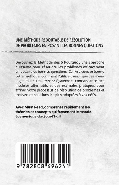 Découvrez la Méthode des 5 Pourquoi, une approche puissante pour résoudre les problèmes efficacement en posant les bonnes questions. Ce livre vous présente cette méthode, comment l'utiliser, ainsi que ses avantages et limites. Prenez également connaissance des modèles alternatifs et des exemples pratiques pour affiner votre processus de résolution de problèmes et trouver les solutions les plus adaptées à vos défis.