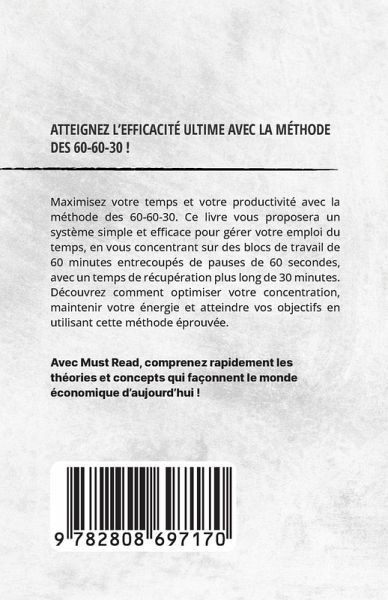 Maximisez votre temps et votre productivité avec la méthode des 60-60-30. Ce livre vous proposera un système simple et efficace pour gérer votre emploi du temps, en vous concentrant sur des blocs de travail de 60 minutes entrecoupés de pauses de 60 secondes, avec un temps de récupération plus long de 30 minutes. Découvrez comment optimiser votre concentration, maintenir votre énergie et atteindre vos objectifs en utilisant cette méthode éprouvée.