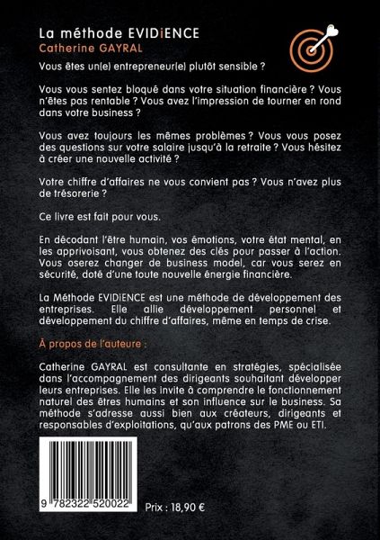 Vous êtes un(e) entrepreneur(e) plutôt sensible ? Vous vous sentez bloqué dans votre situation financière ? Vous n'êtes pas rentable ? Vous avez l'impression de tourner en rond dans votre business ? Vous avez toujours les mêmes problèmes ? Vous vous posez des questions sur votre salaire jusqu'à la retraite ? Vous hésitez à créer une nouvelle activité ?Votre chiffre d'affaires ne vous convient pas ? Vous n'avez plus de trésorerie ?Ce livre est fait pour vous. En décodant l'être humain, vos émotions, votre état mental, en les apprivoisant, vous aurez les clés pour passer à l'action. Vous oserez changer de business model, car vous serez en sécurité, doté d'une toute nouvelle énergie financière.La Méthode EVIDiENCE est une méthode de développement des entreprises. Elle allie développement personnel et développement du chiffre d'affaires, même en temps de crise.