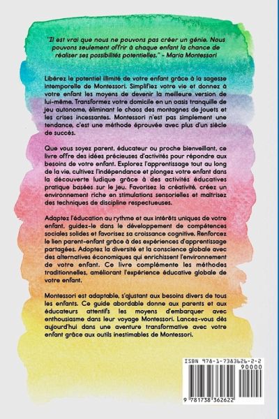 Un guide amical et TOTALEMENT COMPLET : Le seul livre Montessori dont vous aurez besoin. Pour les âges de 0 à 5 ans : Pas besoin d'acheter 3 livres différents. Ce livre contient toute la théorie et la pratique pour les bébés, les tout-petits, les enfants d'âge préscolaire et au-delà. Une liste de plus de 300 activités : Une liste complète d'activités créatives à faire à la maison et à l'extérieur, soigneusement divisée par groupe d'âge et type d'activité. Anecdotes réelles : Ce livre est rempli de témoignages et d'histoires réelles de parents qui partagent leurs expériences précieuses avec la méthode Montessori dans leurs foyers. La maison Montessori : Profitez du processus de transformation de votre maison en un havre Montessori avec un guide simple pièce par pièce. Voici une fraction de ce que vous trouverez dans ce livre : Apprentissage à vie : Un guide qui pose les bases de l'amour d'un enfant pour l'apprentissage, en favorisant une curiosité qui dure toute une vie. Cultiver l'indépendance : Donnez à votre enfant des compétences pratiques, créant une fondation pour la prise de décision confiante et l'autosuffisance. Découverte ludique : Plongez votre enfant dans la joie d'apprendre à travers des activités pratiques et ludiques qui stimulent la créativité. Nourrir la créativité : Découvrez des méthodes pour encourager l'imagination d'un enfant et sa pensée innovante, préparant le terrain pour un succès futur. Environnement riche en sensations : Explorez comment un environnement soigneusement élaboré améliore les expériences sensorielles, favorisant le développement cognitif. Techniques de discipline douce : Apprenez des stratégies de discipline efficaces qui se concentrent sur la compréhension et la guidée positive du comportement d'un enfant. Chemins d'apprentissage individualisés : Adaptez l'éducation au rythme et aux intérêts uniques de votre enfant, en embrassant l'approche Montessori de l'apprentissage personnalisé. Harmonie sociale : Guidez votre enfant dans le développement de solides compétences sociales, en favorisant l'empathie et en créant des amitiés durables. Stimulation cognitive : Offrez à votre enfant les défis mentaux qu'il recherche, favorisant la croissance cognitive et les capacités de résolution de problèmes. Renforcement du lien parent-enfant : Renforcez votre relation avec votre enfant à travers des expériences d'apprentissage partagées et des activités collaboratives. Respect pour la diversité : Embrassez des activités qui encouragent une appréciation pour différentes cultures, favorisant la sensibilisation mondiale. Liste de plus de 300 activités : Explorez une liste étendue d'activités appropriées à l'âge qui sont conformes aux principes Montessori. . Notre livre ne prône pas l'abandon des méthodes traditionnelles mais les améliore. Découvrez comment les principes Montessori complètent et élèvent l'expérience éducative globale de votre enfant. Montessori est intrinsèquement adaptable, ce qui en fait un merveilleux choix pour les enfants ayant des besoins divers. Notre livre souligne l'essence de Montessori sans besoin de matériel coûteux. Découvrez des alternatives économiques et créez un environnement enrichissant avec n'importe quel budget.<