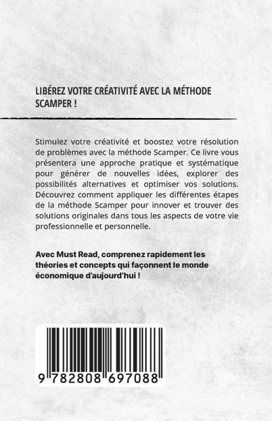 Stimulez votre créativité et boostez votre résolution de problèmes avec la méthode Scamper. Ce livre vous présentera une approche pratique et systématique pour générer de nouvelles idées, explorer des possibilités alternatives et optimiser vos solutions. Découvrez comment appliquer les différentes étapes de la méthode Scamper pour innover et trouver des solutions originales dans tous les aspects de votre vie professionnelle et personnelle.