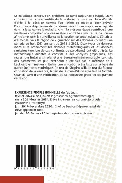 Le paludisme constitue un problème de santé majeur au Sénégal. Étant conscient de la saisonnalité de la maladie, la mise en place d'outils d'aide à la décision comme l'utilisation de modèles pour prévoir l'occurrence d'épidémies de paludisme serait d'une importance capitale dans la lutte contre la maladie. Ainsi, la présente étude contribue à une meilleure compréhension des relations entre le climat et le paludisme afin d'améliorer la surveillance et la gestion de cette maladie. L'étude a été menée dans la région de Ziguinchor sur des données couvrant une période de huit (08) ans soit de 2015 à 2022. Deux types de données mensuelles notamment les données météorologiques et les données sanitaires (nombre de cas confirmés de paludisme) ont été utilisés. La méthodologie adoptée a consisté à des analyses graphiques, des régressions linéaires simples et une régression linéaire multiple. Le choix des paramètres les plus pertinents a été fait par la méthode de « backward elimination ». Enfin, une validation a été faite sur la base de quatre (04) tests statistiques (le test de Shapiro-Wilk, le test du facteur d'inflation de la variance, le test de Durbin-Watson et le test de Goldef-Quandt) suivi d'une vérification de sa robustesse grâce au diagramme de Taylor.
