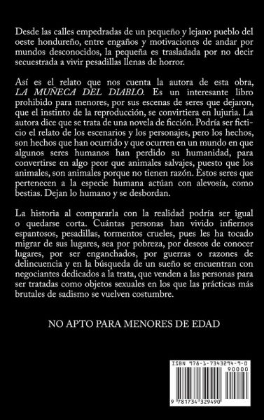 Desde las calles empedradas de un pequeño y lejano pueblo del oeste hondureño, entre engaños y motivaciones de andar por mundos desconocidos, la pequeña es trasladada por no decir secuestrada a vivir pesadillas llenas de horror. Así es el relato que nos cuenta la autora de esta obra, la MUÑECA DEL DIABLO. un interesante libro prohibido para menores, por sus escenas de seres que dejaron, que el instinto de la reproducción, se convirtiera en lujuria. La autora dice que se trata de una novela de ficción. Podría ser ficticio el relato de los escenarios y los personajes, pero los hechos, son hechos que han ocurrido y que ocurren en un mundo en que algunos seres humanos han perdido su humanidad, para convertirse en algo peor que animales salvajes, puesto que los animales, son animales porque no tienen razón. Estos seres que pertenecen a la especie humana actúan con alevosía, como bestias. Dejan lo humano y se desbordan.
