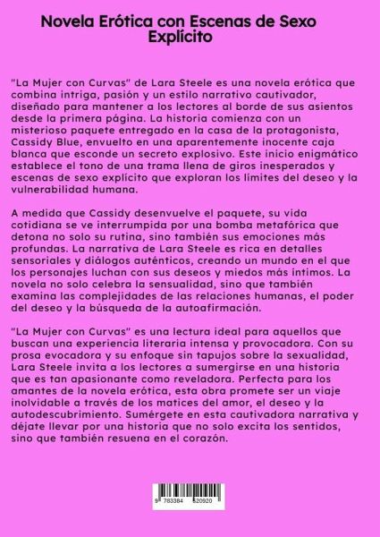 "La Mujer con Curvas" de Lara Steele es una novela erótica que combina intriga, pasión y un estilo narrativo cautivador, diseñado para mantener a los lectores al borde de sus asientos desde la primera página. La historia comienza con un misterioso paquete entregado en la casa de la protagonista, Cassidy Blue, envuelto en una aparentemente inocente caja blanca que esconde un secreto explosivo. Este inicio enigmático establece el tono de una trama llena de giros inesperados y escenas de sexo explícito que exploran los límites del deseo y la vulnerabilidad humana.A medida que Cassidy desenvuelve el paquete, su vida cotidiana se ve interrumpida por una bomba metafórica que detona no solo su rutina, sino también sus emociones más profundas. La narrativa de Lara Steele es rica en detalles sensoriales y diálogos auténticos, creando un mundo en el que los personajes luchan con sus deseos y miedos más íntimos. La novela no solo celebra la sensualidad, sino que también examina las complejidades de las relaciones humanas, el poder del deseo y la búsqueda de la autoafirmación."La Mujer con Curvas" es una lectura ideal para aquellos que buscan una experiencia literaria intensa y provocadora. Con su prosa evocadora y su enfoque sin tapujos sobre la sexualidad, Lara Steele invita a los lectores a sumergirse en una historia que es tan apasionante como reveladora. Perfecta para los amantes de la novela erótica, esta obra promete ser un viaje inolvidable a través de los matices del amor, el deseo y la autodescubrimiento. Sumérgete en esta cautivadora narrativa y déjate llevar por una historia que no solo excita los sentidos, sino que también resuena en el corazón.