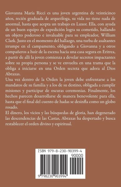 Giovanna María Ricci es una joven argentina de veinticinco años, recién graduada de arqueóloga, su vida no tiene nada de anormal, hasta que acepta un trabajo en Luxor. Ella, con ayuda de un buen equipo de expedición logra su cometido, hallando un objeto poderoso e invaluable para su empleador, William Clark. Justo en el momento del hallazgo, una turba de asaltantes irrumpe en el campamento, obligando a Giovanna y a otros compañeros a huir de la escena hacia una casa segura en Eritrea, a partir de allí la joven comienza a develar secretos impactantes sobre su propia persona y se ve envuelta en una trama que la obliga a iniciarse en una Orden secreta que adora al Dios Abraxas. Una vez dentro de la Orden la joven debe enfrentarse a los mandatos de su familia y a los de su destino, obligada a cumplir misiones y participar de oscuras ceremonias. Finalmente, los hechos parecen desarrollarse de manera benevolente para ella, hasta que el final del cuento de hadas se desinfla como un globo rosado. El dinero, los vicios y las búsquedas de gloria, han degenerado las descendencias de las Castas, Abraxas ha despertado y busca restablecer el orden divino y espiritual.
