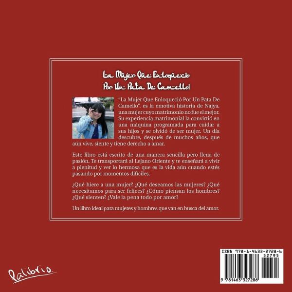 La Mujer Que Enloqueció Por Un Pata De Camello, es la emotiva historia de Najya, una mujer como tú y como yo que se caso con un hombre que le destruyo la vida. Esta experiencia la convirtió en una maquina programada para cuidar a sus hijos y se olvido de ser mujer. Pero, un día descubre que es una mujer, un ser humano que tiene derecho amar. Este libro está escrito de una manera sencilla pero llena de pasión. Te transportara al Lejano Oriente y te enseñara a vivir a plenitud y ver lo hermosa que es la vida aun cuando estés pasando por momentos difíciles. ¿Que hiere a una mujer? ¿Que deseamos las mujeres? ¿Que necesitamos para ser felices? ¿Cómo piensan los hombres? ¿Que sienten?¿ Vale la pena todo por amor? Un libro ideal para mujeres y hombres que van en búsqueda del amor.