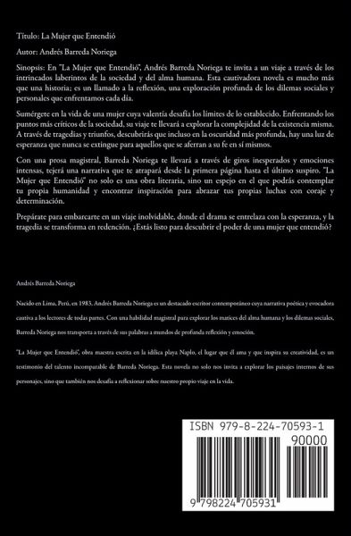 Título: La Mujer que Entendió Autor: Andrés Barreda Noriega Sinopsis: En "La Mujer que Entendió", Andrés Barreda Noriega te invita a un viaje a través de los intrincados laberintos de la sociedad y del alma humana. Esta cautivadora novela es mucho más que una historia; es un llamado a la reflexión, una exploración profunda de los dilemas sociales y personales que enfrentamos cada día. Sumérgete en la vida de una mujer cuya valentía desafía los límites de lo establecido. Enfrentando los puntos más críticos de la sociedad, su viaje te llevará a explorar la complejidad de la existencia misma. A través de tragedias y triunfos, descubrirás que incluso en la oscuridad más profunda, hay una luz de esperanza que nunca se extingue para aquellos que se aferran a su fe en sí mismos. Con una prosa magistral, Barreda Noriega te llevará a través de giros inesperados y emociones intensas, tejerá una narrativa que te atrapará desde la primera página hasta el último suspiro. "La Mujer que Entendió" no solo es una obra literaria, sino un espejo en el que podrás contemplar tu propia humanidad y encontrar inspiración para abrazar tus propias luchas con coraje y determinación. Prepárate para embarcarte en un viaje inolvidable, donde el drama se entrelaza con la esperanza, y la tragedia se transforma en redención. ¿Estás listo para descubrir el poder de una mujer que entendió?