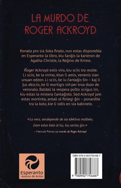 Konata pro sia ¿oka finalo, nun estas disponebla en Esperanto la libro, kiu ¿an¿is la karieron de Agatha Christie, la Re¿ino de Krimo. Roger Ackroyd estis viro, kiu sciis tro multe. Li sciis, ke la virino, kiun li amis, venenis sian unuan edzon. Li sciis, ke iu ¿antäis ¿in - kaj li ¿us eksciis, ke ¿i mortigis sin per troa dozo de veronalo. Baldä la vespera pöto sciigus lin, kiu estas la mistera ¿antäisto. Sed Ackroyd jam estas mortinta, antä ol finlegi ¿in - ponardite tra la kolo, kie li sidis en sia kabineto. La vero, sendepende de sia efektiva malbelo, ¿iam estas bela al tiu, kiu ser¿as ¿in. - Hercule Poirot, La murdo de Roger Ackroyd