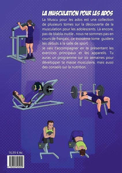 Ce troisième tome de "La Muscu pour les Ados" est destiné aux adolescents qui souhaitent pratiquer la musculation en salle de sport. Après l'entrée en matière proposée par le tome 1, et l'initiation au travail avec charges traitée dans le tome 2, cette version s'adresse aux adolescents à partir de 16 ans.Au programme du tome 3, la découverte des différents espaces d'entraînement d'une salle de sport, mais aussi une explication sur les différentes méthodes d'entraînement. Vous y trouverez aussi 26 exercices décris avec les consignes, les muscles sollicités et les erreurs à éviter.Ce livre contient un programme de musculation sur 6 semaines à raison de deux séances hebdomadaires.La dernière partie traite de l'importance de l'alimentation avec les conseils du coach et du nutritionniste.Chers parents, si votre ado débute la musculation, ne stressez pas, notre livre est là l'accompagner à réaliser les bons mouvements. Le programme est adapté à leur condition physique et leur âge.Chers ados ! Si tu veux développer ta force et ta masse musculaire en travaillant avec des charges à la salle de sport, c'est le livre qu'il te faut.