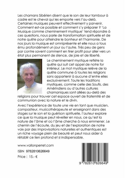 Les chamans Sibérien disent que le son de leur tambour à cadre est le cheval qui les emporte vers l'au-delà. Certaines musiques peuvent effectivement y parvenir. Comment est-ce possible et comment s'y préparer ? 'La Musique comme cheminement mystique' tend répondre à ces questions. Avec l'expérience de toute une vie en tant que musicien, compositeur, musicothérapeute et enseignant dans des stages sur le son et la guérison spirituelle, l'auteur explore ce que la musique peut réveiller en nous, ce qu'est la nature de l'âme et où l'âme cherche à nous emmener. Le chemin de l'écoute, du jeu et de l'exploration de notre voix par des improvisations naturelles et authentiques est un riche voyage plein de beauté et peut nous aider à rétablir ce lien profond et si indispensable.Le cheminement mystique reflète la quête qui suit cet appel de notre for intérieur. Le mot mystique relève de la quête commune à toutes les religions sans appartenir à aucune d'entre elles exclusivement. Toute les traditions mystiques, comme celle des Soufis, des Amérindiens ou d'autres cultures chamaniques sont allées au-delà des religions pour trouver cet espace ouvert de fraternité et de communion avec la nature et le divin.