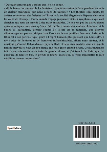 " Que faire dans un gîte à moins que l¿on n¿y songe ? a dit le bon et incomparable La Fontaine... Que faire surtout à Paris pendant les mois de chaleur caniculaire que nous venons de traverser ? Les théâtres sont morts, les artistes se reposent des fatigues de l¿hiver, et la société élégante se disperse dans tous les coins de l¿Europe ; tout le monde voyage jusqüaux vieilles symphonies, qui vont chercher aux eaux un remède à des maux incurables. Ce ne sont pas les dix ou douze opéras-comiques nouveaux qüon a fait défiler comme des ombres chinoises, ni le ballet de Sacountala, dernier soupir de l¿école de la fantaisie, qui peuvent dédommager un pauvre critique dans l¿exercice de ses pénibles fonctions. Puisque le Rhin est à nos portes, et que, grâce à l¿esprit humain, plus puissant que Louis XIV, il n¿y a plus de Pyrénées ni de frontières infranchissables, allons nous assurer, si la musique qüon fait là-bas, dans ce pays de Bade et lieux circonvoisins dont on raconte tant de merveilles, vaut un peu mieux que celle qüon entend à Paris. Ce raisonnement fait, je me suis confié à un train de grande vitesse, et j¿ai franchi le Rhin, que j¿ai parcouru de haut en bas. Je prends la liberté, monsieur, de vous transmettre le récit véridique de mes impressions."