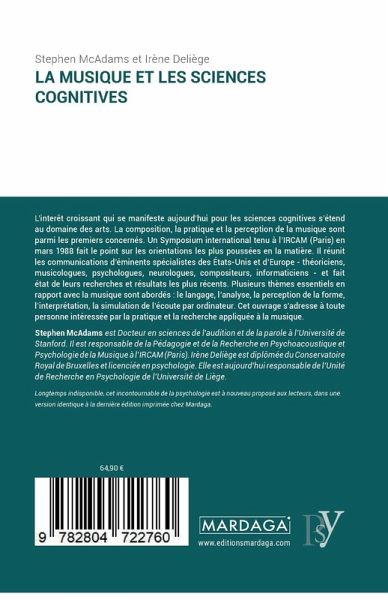 L'interêt croissant qui se manifeste aujourd'hui pour les sciences cognitives s'étend au domaine des arts. La composition, la pratique et la perception de la musique sont parmi les premiers concernés. Un Symposium international tenu à l'IRCAM (Paris) en mars 1988 fait le point sur les orientations les plus poussées en la matière. Il réunit les communications d'éminents spécialistes des États-Unis et d'Europe - théoriciens, musicologues, psychologues, neurologues, compositeurs, informaticiens - et fait état de leurs recherches et résultats les plus récents. Plusieurs thèmes essentiels en rapport avec la musique sont abordés : le langage, l'analyse, la perception de la forme, l'interprétation, la simulation de l'écoute par ordinateur. Cet ouvrage s'adresse à toute personne intéressée par la pratique et la recherche appliquée à la musique. Stephen McAdams est Docteur en sciences de l¿audition et de la parole à l¿Université de Stanford. Il est responsable de la Pédagogie et de la Recherche en Psychoacoustique et Psychologie de la Musique à l¿IRCAM (Paris).//Irène Deliège est diplômée du Conservatoire Royal de Bruxelles et licenciée en psychologie. Elle est aujourd¿hui responsable de l¿Unité de Recherche en Psychologie de l¿Université de Liège.