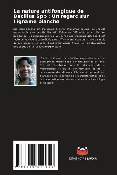Les champignons ont été isolés à partir d'ignames pourries et ont été ensemencés avec des Bacillus afin d'observer l'efficacité du contrôle des Bacillus sur les champignons. Ce livre donne une procédure détaillée. Il est facile de reproduire cette étude sans difficulté en raison de la nature simple de la procédure expliquée. Il est recommandé à tous les microbiologistes intéressés par la recherche exploratoire.