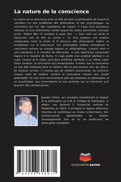 La nature de la conscience joue un rôle clé dans la philosophie de l'esprit et constitue l'un des problèmes des philosophes et des psychologues. La conscience est l'un des ingrédients de l'esprit. Il s'agit d'un processus intérieur ou d'un phénomène mental auquel les autres personnes n'ont pas accès. Gilbert Ryle l'a souligné à juste titre : « Seul celui qui porte la chaussure sait où elle se coince ». Ce livre propose une analyse comparative entre la vision et le discours des philosophes indiens et occidentaux sur la conscience. Les philosophes indiens considèrent la conscience comme un concept logique ou philosophique. L'esprit n'est ni une substance à la manière de Descartes, ni une expérience sensorielle fugace à la manière de Hume. Il s'agit plutôt d'un prédicat attribué à un sujet. L'esprit et le corps sont deux prédicats attribués à un même sujet. Selon Sankara, la conscience est omniprésente. À moins que la conscience ne soit déjà impliquée dans la matière, elle ne peut évoluer hors de celle-ci. En d'autres termes, il n'existe pas de matière inconsciente. Au contraire, chaque unité de matière contient la conscience comme une simple potentialité. Ce livre sera extrêmement utile aux étudiants en philosophie et en psychologie, aux universitaires et aux profanes qui ne cherchent qu'à acquérir des connaissances.