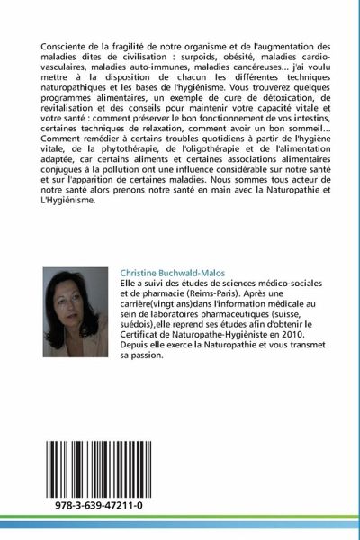 Consciente de la fragilité de notre organisme et de l'augmentation des maladies dites de civilisation : surpoids, obésité, maladies cardio-vasculaires, maladies auto-immunes, maladies cancéreuses... j'ai voulu mettre à la disposition de chacun les différentes techniques naturopathiques et les bases de l'hygiénisme. Vous trouverez quelques programmes alimentaires, un exemple de cure de détoxication, de revitalisation et des conseils pour maintenir votre capacité vitale et votre santé : comment préserver le bon fonctionnement de vos intestins, certaines techniques de relaxation, comment avoir un bon sommeil... Comment remédier à certains troubles quotidiens à partir de l'hygiène vitale, de la phytothérapie, de l'oligothérapie et de l'alimentation adaptée, car certains aliments et certaines associations alimentaires conjugués à la pollution ont une influence considérable sur notre santé et sur l'apparition de certaines maladies. Nous sommes tous acteur de notre santé alors prenons notre santé en main avec la Naturopathie et L'Hygiénisme.
