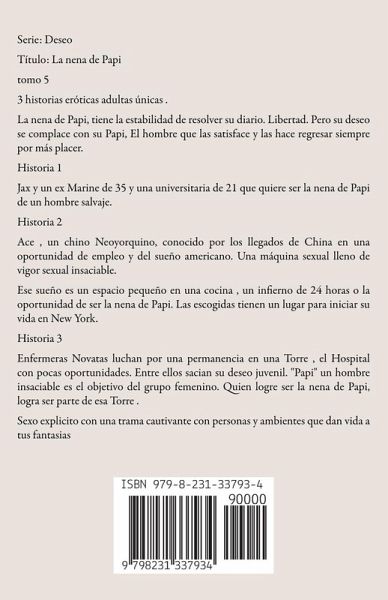 Serie: Deseo Título: La nena de Papi tomo 5 3 historias eróticas adultas únicas . La nena de Papi, tiene la estabilidad de resolver su diario. Libertad. Pero su deseo se complace con su Papi, El hombre que las satisface y las hace regresar siempre por más placer. Historia 1 Jax y un ex Marine de 35 y una universitaria de 21 que quiere ser la nena de Papi de un hombre salvaje. Historia 2 Ace , un chino Neoyorquino, conocido por los llegados de China en una oportunidad de empleo y del sueño americano. Una máquina sexual lleno de vigor sexual insaciable. Ese sueño es un espacio pequeño en una cocina , un infierno de 24 horas o la oportunidad de ser la nena de Papi. Las escogidas tienen un lugar para iniciar su vida en New York. Historia 3 Enfermeras Novatas luchan por una permanencia en una Torre , el Hospital con pocas oportunidades. Entre ellos sacian su deseo juvenil. "Papi" un hombre insaciable es el objetivo del grupo femenino. Quien logre ser la nena de Papi, logra ser parte de esa Torre . Sexo explicito con una trama cautivante con personas y ambientes que dan vida a tus fantasias