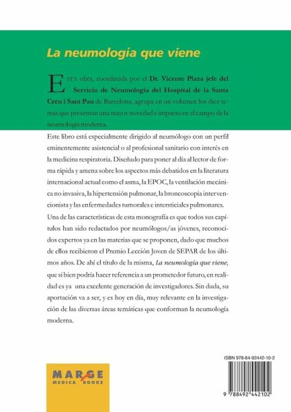 Esta obra agrupa en un volumen los diez temas que presentan una mayor novedad e impacto en el campo de la neumología moderna. Está especialmente dirigida al neumólogo con un perfil eminentemente asistencial, o al profesional sanitario con interés en la medicina respiratoria, y ha sido diseñada para poner al día al lector de forma rápida y amena sobre los aspectos más debatidos en la literatura internacional actual, como el asma, la EPOC, la ventilación mecánica no invasiva, la hipertensión pulmonar, la broncoscopia intervencionista y las enfermedades tumorales e intersticiales pulmonares.