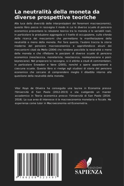 Alla luce della diversità delle interpretazioni dei fenomeni macroeconomici, questo libro passa in rassegna il modo in cui le diverse scuole di pensiero economico presentano la relazione teorica tra la moneta e le variabili reali, in particolare la produzione aggregata e il livello di occupazione, sullo sfondo della ricerca dei meccanismi che permettono la manifestazione della neutralità o meno della moneta. Per fare questo, l'autore traccia la storia moderna del pensiero macroeconomico e approfondisce alcuni dei meccanismi citati da Mollo (2004) che rendono possibile la neutralità o meno della moneta e che riflettono le posizioni di diverse scuole di pensiero economico (neoclassica, monetarista, neoclassica, neokeynesiana e post-keynesiana). Nel preparare la rassegna, si è attinto a studi di commentatori, in particolare Snowdon e Vane (2005), nonché a opere appartenenti a ciascuna scuola. Questo libro si rivolge agli studiosi di storia del pensiero economico che cercano di comprendere meglio il dibattito intorno alla questione della neutralità della moneta.