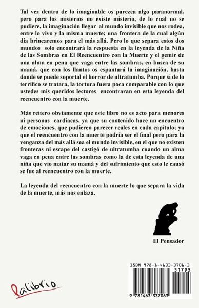 Tal vez dentro de lo imaginable os parezca algo paranormal, pero para los misterios no existe misterio, de lo cual no se pudiere, la imaginación llegar al mundo invisible que nos rodea, entre lo vivo y la misma muerte; una frontera de la cual algún día brincaremos para el más allá. Pero lo que separa estos dos mundos solo encontrará la respuesta en la leyenda de la Niña de las Sombras en El Reencuentro con la Muerte y el gemir de una alma en pena que vaga entre las sombras, en busca de su mamá, que con los llantos os espantará la imaginación, hasta donde se puede soportal el horror de ultratumba. Porque si de lo terrífico se tratara, la tortura fuera poca comparable con lo que ustedes mis queridos lectores encontraran en esta leyenda del reencuentro con la muerte. Más reitero obviamente que este libro no es acto para menores ni personas cardiacas, ya que su contenido hace un encuentro de emociones, que pudieren parecer reales en cada capítulo; ya que el reencuentro con la muerte podría ser el final pero para la venganza del más allá sea el mundo invisible, en el que no existen fronteras ni escape del castigó de ultratumba cuando un alma vaga en pena entre las sombras como la de esta leyenda de una niña que vio matar su mamá y del sufrimiento que esto le causó se fue al reencuentro con la muerte. La leyenda del reencuentro con la muerte lo que separa la vida de la muerte, más nos enlaza. El Pensador
