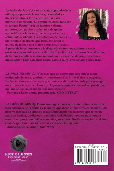 La Niña de Mis Ojos es un viaje al pasado de la niña que a pesar de la tristeza, la soledad y el dolor encontró la forma de disfrutar cada momento de su vida. Sus primeros doce años con su amado Papito José; un hombre valiente, amoroso, compasivo y trabajador de quien aprendió a ser honesta y fuerte, agradecida y sobre todo resiliente. Esta colección de poesía es un tributo a su abuelo que llenó con amor el anhelo de tener a una mama y todos sus vacíos. A pesar de leyes humanos y la distancia de fronteras, siempre están presentes en su vida sus enseñanzas. Éste libro es un abrazo lleno de amor de la mujer adulta a su niña interior, un mensaje de alegría y esperanza diciéndole: "Todo está bien ahora, estás a salvo, eres amada y muy feliz."