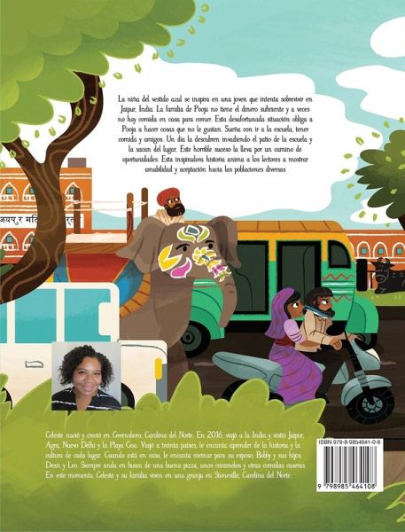 La niña del vestido azul se inspira en una joven que intenta sobrevivir en Jaipur, India. La familia de Pooja no tiene el dinero suficiente y a veces no hay comida en casa para comer. Esta desafortunada situación obliga a Pooja a hacer cosas que no le gustan. Sueña con ir a la escuela, tener comida y amigos. Un día la descubren invadiendo el patio de la escuela y la sacan del lugar. Este horrible suceso la lleva por un camino de oportunidades. Esta inspiradora historia anima a los lectores a mostrar amabilidad y aceptación hacia las poblaciones diversas.