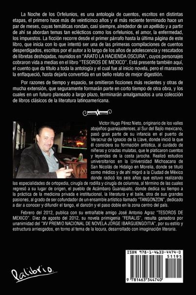 La Noche de los Orfelunios, es una antología de cuentos, escritos en distintas etapas, el primero hace más de veinticinco años y el más reciente terminado hace un par de meses, cuyas temáticas rondan, casi siempre, alrededor de un apellido y a partir de ahí se abordan temas tan eclécticos como los orfelunios, el amor, la enfermedad, los impuestos. La ficción recorre desde el primer párrafo hasta la última página de este libro, que inicia con lo que intentó ser una de las primeras compilaciones de cuentos desperdigados, escritos por el autor a lo largo de los años de adolescencia y rescatados de libretas deshojadas, reunidos en "ARATO LA HACIENDA OSCURA", cuyos personajes cobraron vida a medias en el libro "TESOROS DE MEXICO". Está presente también aquí, el cuento que da título a toda la antología y el cual fue al inicio novela, pero el marasmo la enflaqueció, hasta dejarla convertida en un bello relato de mejor digestión. Por razones de tiempo y espacio, se omitieron ficciones más recientes y otras de mucha extensión, que seguramente formarán parte en corto tiempo de otra obra, y los cuales en un futuro planeado a largo plazo, terminarán amalgamados a una colección de libros clásicos de la literatura latinoamericana.