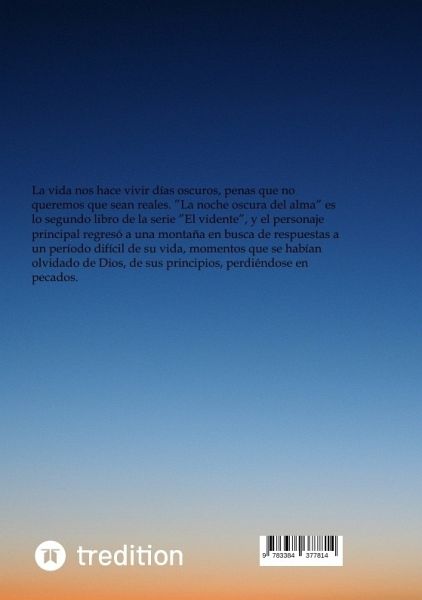 La vida nos hace vivir días oscuros, penas que no queremos que sean reales. "La noche oscura del alma" es lo segundo libro de la serie "El vidente", y el personaje principal regresó a una montaña en busca de respuestas a un período difícil de su vida, momentos que se habían olvidado de Dios, de sus principios, perdiéndose en pecados. Este libro es una trave-sía llena de peligros, piratas, una gran aventura en el mar, nos trae reflexiones y preguntas, que nos preguntamos si se-ría posible que un criminal se recupere después de hundirse completamente en la oscuridad y, en caso afirmativo, ¿halla-rá la paz por sus crímenes? ¿Encontrar el perdón en sí mis-mo? ¿Encontraría la felicidad? ¿O sería sólo una ilusión, una tregua de una noche aún más oscura?