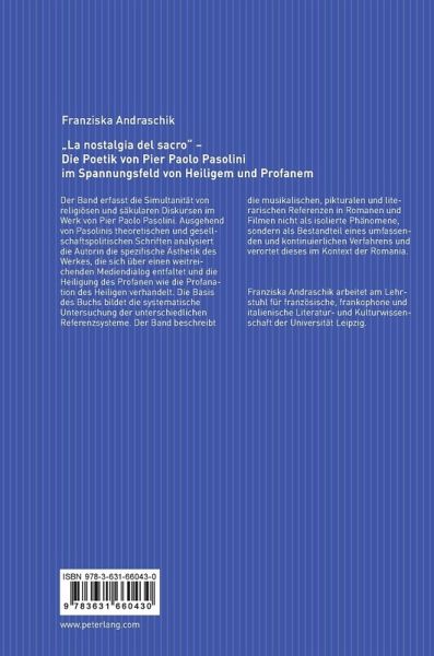 Der Band erfasst die Simultanität von religiösen und säkularen Diskursen im Werk von Pier Paolo Pasolini. Ausgehend von Pasolinis theoretischen und gesellschaftspolitischen Schriften analysiert die Autorin die spezifische Ästhetik des Werkes, die sich über einen weitreichenden Mediendialog entfaltet und die Heiligung des Profanen wie die Profanation des Heiligen verhandelt. Die Basis des Buchs bildet die systematische Untersuchung der unterschiedlichen Referenzsysteme. Der Band beschreibt die musikalischen, pikturalen und literarischen Referenzen in Romanen und Filmen nicht als isolierte Phänomene, sondern als Bestandteil eines umfassenden und kontinuierlichen Verfahrens und verortet dieses im Kontext der Romania.