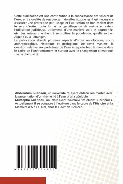 Cette publication est une contribution à la connaissance des valeurs de l'eau, en sa qualité de ressources naturelles auxquelles il est nécessaire d'assurer une protection par l'usage et l'utilisation en bon escient dans le sens d'éviter toute forme de gaspillage ou de mettre en valeur l'utilisation judicieuse, utillement, d'une manière utile et appropriée, etc. Les auteurs cherchent à sensibiliser la population, qu'elle soit en Algérie ou à l'étranger.La publication aborde plusieurs aspects d'ordre sociologique, socio anthropologique, historique et géologique. De cette manière, la question relative aux problèmes de l'eau interpelle tout le monde dans le cadre de l'environnement et surtout avec le changement climatique, thème d'actualité.