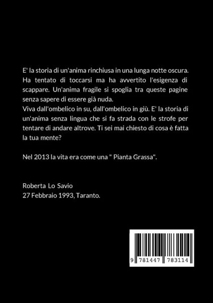 E' la storia di un'anima rinchiusa in una lunga notte oscura. Ha tentato di toccarsi ma ha avvertito l'esigenza di scappare. Un'anima fragile si spoglia tra queste pagine senza sapere di essere già nuda. Viva dall'ombelico in su, dall'ombelico in giù. E' la storia di un'anima senza lingua che si fa strada con le strofe per tentare di andare altrove. Ti sei mai chiesto di cosa è fatta la tua mente?