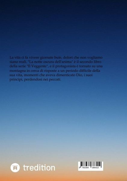 La vita ci fa vivere giornate buie, dolori che non vogliamo siano reali. "La notte oscura dell'anima" è il secondo libro della serie "Il Veggente", e il protagonista è tornato su una montagna in cerca di risposte a un periodo difficile della sua vita, momenti che aveva dimenticato Dio, i suoi principi, perdendosi nei peccati. Questo libro è un viaggio pieno di pericoli, pirati, una grande avventura in mare, ci porta rifles-sioni e domande, che ci chiediamo se sarebbe possibile per un criminale riprendersi dopo essere sprofondato comple-tamente nell'oscurità e, in tal caso, troverà pace per i suoi crimini? Trovare il perdono in se stessi? Avrei trovato la feli-cità? O era solo un'illusione, una tregua da una notte ancora più buia?
