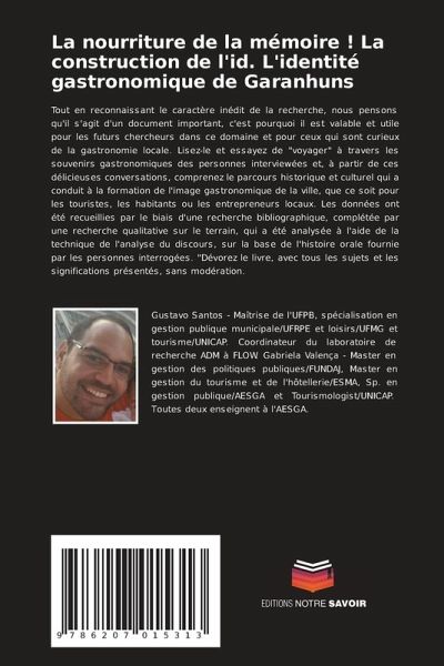 Tout en reconnaissant le caractère inédit de la recherche, nous pensons qu'il s'agit d'un document important, c'est pourquoi il est valable et utile pour les futurs chercheurs dans ce domaine et pour ceux qui sont curieux de la gastronomie locale. Lisez-le et essayez de "voyager" à travers les souvenirs gastronomiques des personnes interviewées et, à partir de ces délicieuses conversations, comprenez le parcours historique et culturel qui a conduit à la formation de l'image gastronomique de la ville, que ce soit pour les touristes, les habitants ou les entrepreneurs locaux. Les données ont été recueillies par le biais d'une recherche bibliographique, complétée par une recherche qualitative sur le terrain, qui a été analysée à l'aide de la technique de l'analyse du discours, sur la base de l'histoire orale fournie par les personnes interrogées. "Dévorez le livre, avec tous les sujets et les significations présentés, sans modération.