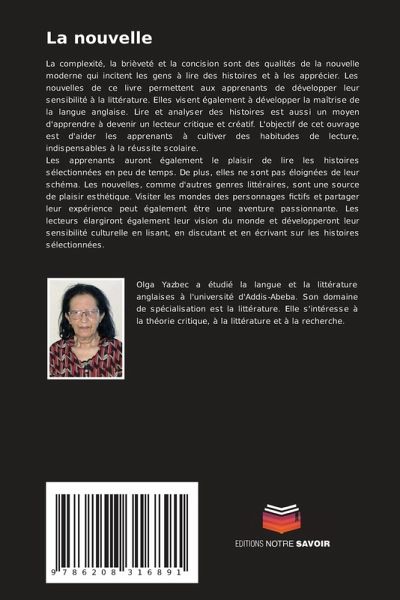 La complexité, la brièveté et la concision sont des qualités de la nouvelle moderne qui incitent les gens à lire des histoires et à les apprécier. Les nouvelles de ce livre permettent aux apprenants de développer leur sensibilité à la littérature. Elles visent également à développer la maîtrise de la langue anglaise. Lire et analyser des histoires est aussi un moyen d'apprendre à devenir un lecteur critique et créatif. L'objectif de cet ouvrage est d'aider les apprenants à cultiver des habitudes de lecture, indispensables à la réussite scolaire.Les apprenants auront également le plaisir de lire les histoires sélectionnées en peu de temps. De plus, elles ne sont pas éloignées de leur schéma. Les nouvelles, comme d'autres genres littéraires, sont une source de plaisir esthétique. Visiter les mondes des personnages fictifs et partager leur expérience peut également être une aventure passionnante. Les lecteurs élargiront également leur vision du monde et développeront leur sensibilité culturelle en lisant, en discutant et en écrivant sur les histoires sélectionnées.