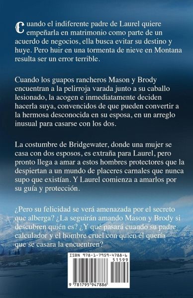 Cuando el indiferente padre de Laurel quiere empeñarla en matrimonio como parte de un acuerdo de negocios, ella busca evitar su destino y huye. Pero huir en una tormenta de nieve en Montana resulta ser un error terrible. Cuando los guapos rancheros Mason y Brody encuentran a la pelirroja varada junto a su caballo lesionado, la acogen e inmediatamente deciden hacerla suya, convencidos de que pueden convertir a la hermosa desconocida en su esposa, en un arreglo inusual para casarse con los dos. La costumbre de Bridgewater, donde una mujer se casa con dos esposos, es extraña para Laurel, pero pronto llega a amar a estos hombres protectores que la despiertan a un mundo de placeres carnales que nunca supo que existían. Y Laurel comienza a amarlos por su guía y protección. ¿Pero su felicidad se verá amenazada por el secreto que alberga? ¿La seguirán amando Mason y Brody si descubren quién es? ¿Y qué pasará cuando su padre calculador y el hombre cruel con quien él quería que se casara la encuentren?