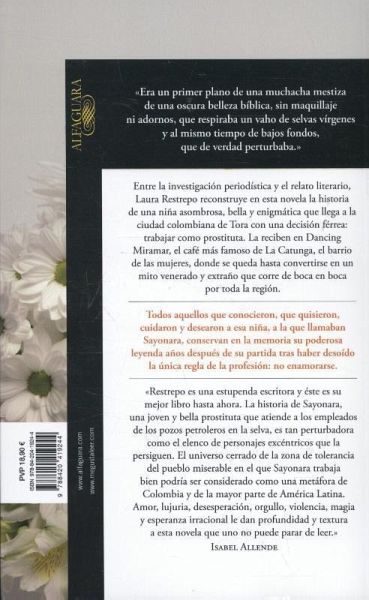 Periodismo y literatura se unen para narrar la historia de una prostituta que se convirtió en un mito en la Colombia de los años sesenta 'Era un primer plano de una muchacha mestiza de una oscura belleza bíblica, sin maquillaje ni adornos, que respiraba un vaho de selvas vírgenes y al mismo tiempo de bajos fondos, que de verdad perturbaba.' Entre la investigación periodística y el relato literario, Laura Restrepo reconstruye en esta novela la historia de una niña asombrosa, bella y enigmática que llega a Tora con una decisión férrea: trabajar como prostituta. La reciben en el Dancing Miramar, el café más famoso de La Catunga, el barrio de las mujeres, donde se queda hasta convertirse en un mito venerado y extraño que corre de boca en boca por toda la región. Todos aquellos que conocieron, que quisieron, cuidaron y desearon a esa niña a la que llamaban Sayonara conservan en su memoria su poderosa leyenda años después de su partida tras haber desoído la única regla de su profesión: no enamorarse. Laura Restrepo fue galardonada con el Premio Alfaguara de Novela en 2004 'Restrepo es una estupenda escritora y éste es su mejor libro hasta ahora. (...) El universo cerrado del barrio rojo podría considerarse una metáfora de Colombia y de la mayor parte de América Latina. El amor, la lujuria, la desesperación, el orgullo, la violencia, la magia y la esperanza irracional dan profundidad y textura a esta novela que uno no puede parar de leer.' Isabel Allende La crítica ha dicho... 'Una historia de amor trágica y brillante.' Library Journal 'La novia oscura es una novela periodística, repleta de agudezas provocadoras y de detalles tan picantes y graciosos que es difícil creer que sean inventados.' New York Times Book Review 'La prosa voluptuosa y lírica de Restrepo logra que uno no quiera cerrar el libro. Y la belleza resplandeciente del lenguaje hace que uno no quiera que termine.' Dallas Morning News 'Merece la pena leer esta novela por lo que nos dice acerca de la lucha por la supervivencia en los márgenes oscuros de la sociedad.' Washington Post Book World 'Es difícil no quedar atrapado por el atrayente torbellino narrativo de Restrepo.' Publishers Weekly