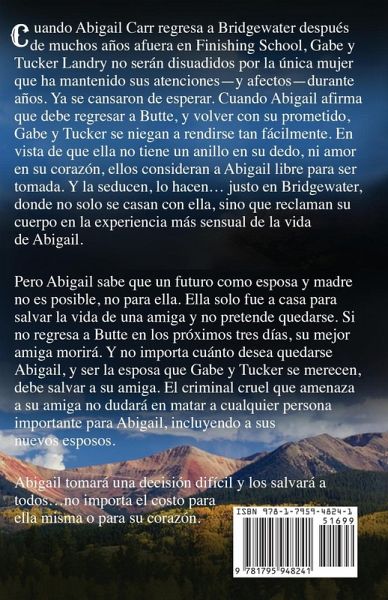 Cuando Abigail Carr regresa a Bridgewater después de muchos años afuera en Finishing School, Gabe y Tucker Landry no serán disuadidos por la única mujer que ha mantenido sus atenciones—y afectos—durante años. Ya se cansaron de esperar. Cuando Abigail afirma que debe regresar a Butte, y volver con su prometido, Gabe y Tucker se niegan a rendirse tan fácilmente. En vista de que ella no tiene un anillo en su dedo, ni amor en su corazón, ellos consideran a Abigail libre para ser tomada. Y la seducen, lo hacen… justo en Bridgewater, donde no solo se casan con ella, sino que reclaman su cuerpo en la experiencia más sensual de la vida de Abigail. Pero Abigail sabe que un futuro como esposa y madre no es posible, no para ella. Ella solo fue a casa para salvar la vida de una amiga y no pretende quedarse. Si no regresa a Butte en los próximos tres días, su mejor amiga morirá. Y no importa cuánto desea quedarse Abigail, y ser la esposa que Gabe y Tucker se merecen, debe salvar a su amiga. El criminal cruel que amenaza a su amiga no dudará en matar a cualquier persona importante para Abigail, incluyendo a sus nuevos esposos. Abigail tomará una decisión difícil y los salvará a todos…no importa el costo para ella misma o para su corazón.