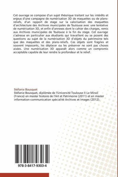 Cet ouvrage se compose d'un sujet théorique traitant sur les intérêts et enjeux d'une campagne de numérisation 3D de maquettes ou de plans-reliefs, d'un rapport de stage sur la valorisation des maquettes d'architecture des Archives municipales de Toulouse avec une tentative de numérisation 3D, et enfin d'annexes dont le cahier des charges, remis aux Archives municipales de Toulouse à la fin du stage. Cet ouvrage s'adresse en particulier aux étudiants qui travaillent ou se posent des questions au sujet de la numérisation 3D d'objets du patrimoine tels que des maquettes et des plans-reliefs. Ces objets sont fragiles et souvent imposants, les déplacer ou les préserver ne sont pas choses aisées. Une numérisation 3D apparaît alors comme un compromis acceptable capable de leur rendre la profondeur et le relief.