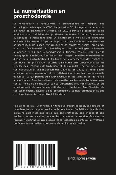 La numérisation a révolutionné la prosthodontie en intégrant des technologies telles que la CFAO, l'impression 3D, l'imagerie numérique et les outils de planification virtuelle. La CFAO permet de concevoir et de fabriquer avec précision des prothèses dentaires à partir d'empreintes numériques, garantissant ainsi un ajustement parfait et une esthétique optimale. L'impression 3D permet la production rapide de modèles dentaires personnalisés, de guides chirurgicaux et de prothèses finales, améliorant ainsi la fonctionnalité et l'esthétique. Les technologies d'imagerie numérique, telles que la tomographie à faisceau conique (CBCT) et la radiographie numérique, fournissent des images détaillées essentielles au diagnostic, à la planification du traitement et à la conception des prothèses. Les outils de planification virtuelle permettent aux prosthodontistes de simuler des scénarios de traitement et des résultats, ce qui améliore la compréhension et la satisfaction des patients. En outre, la numérisation améliore la communication et la collaboration entre les professionnels dentaires, ce qui permet de mieux coordonner les soins et de les rendre plus efficaces. Pour les patients, cela signifie des temps de traitement plus courts, moins de rendez-vous et des procédures plus confortables, ce qui améliore en fin de compte la qualité des soins dentaires. Avec l'évolution de ces technologies, l'avenir de la prosthodontie semble prometteur et des solutions innovantes se profilent à l'horizon.